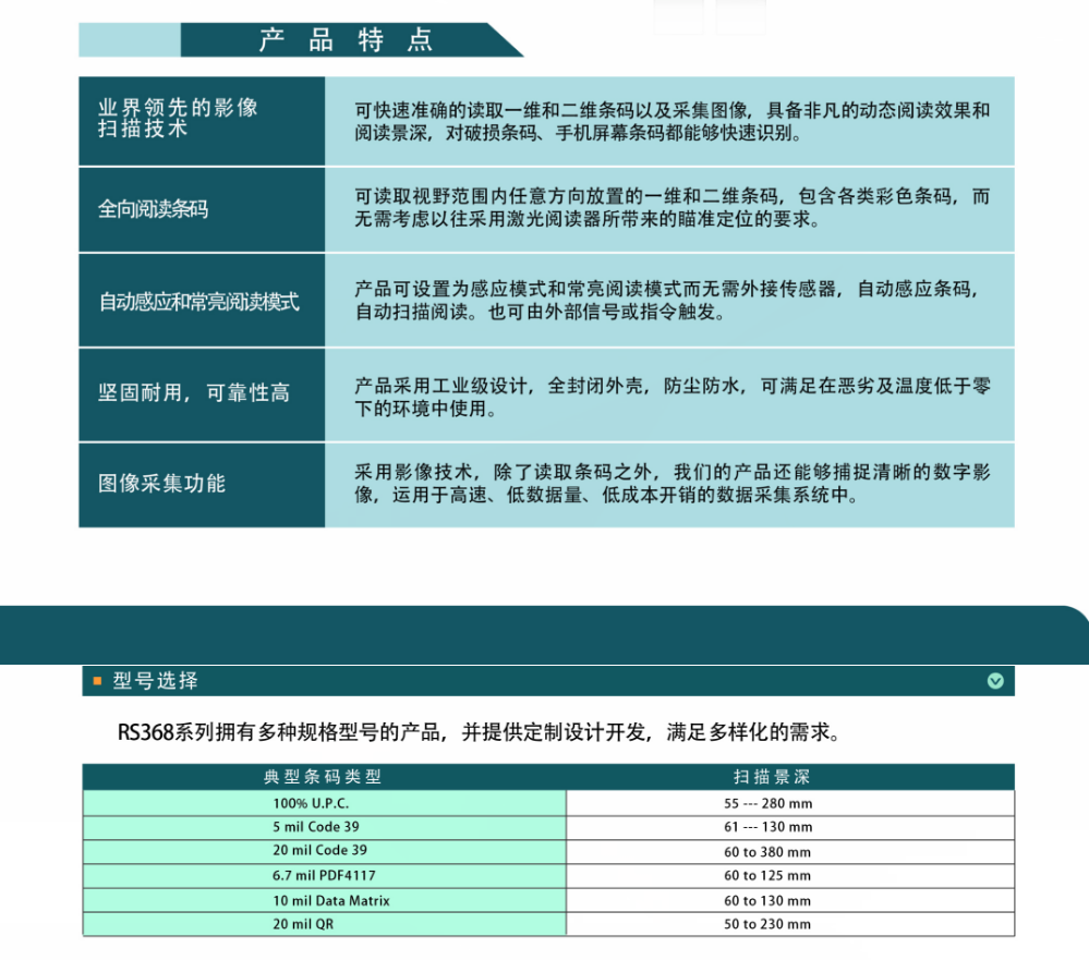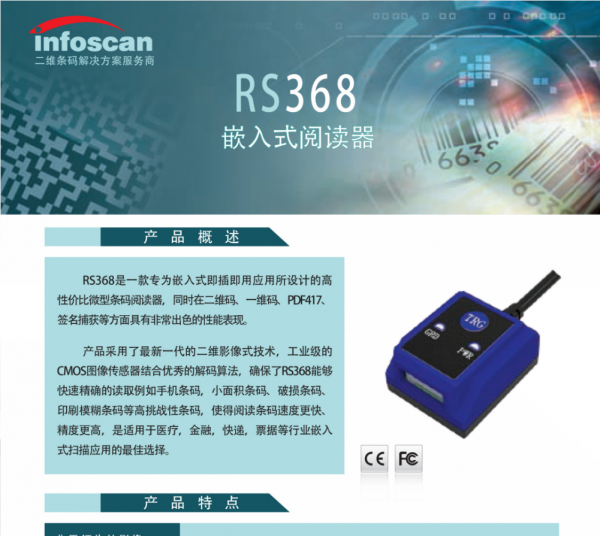 RS368是一款專為嵌入式即插即用應(yīng)用所設(shè)計(jì)的高性價(jià)比微型條碼閱讀器,同時(shí)在二維碼、一維碼、PDF417、簽名捕獲等方面具有非常出色的性能表現(xiàn)。產(chǎn)品采用了最新一代的二維影像式技術(shù),工業(yè)級的CMOS圖像傳感器結(jié)合優(yōu)秀的解碼算法,確保了RS368能夠快速精確的讀取例如手機(jī)條碼,小面積條碼、破損條碼、印刷模糊條碼等高挑戰(zhàn)性條碼,使得閱讀條碼速度更快、精度更高,是適用于醫(yī)療,金融,快遞,票據(jù)等行業(yè)嵌入式掃描應(yīng)用的最佳選擇。